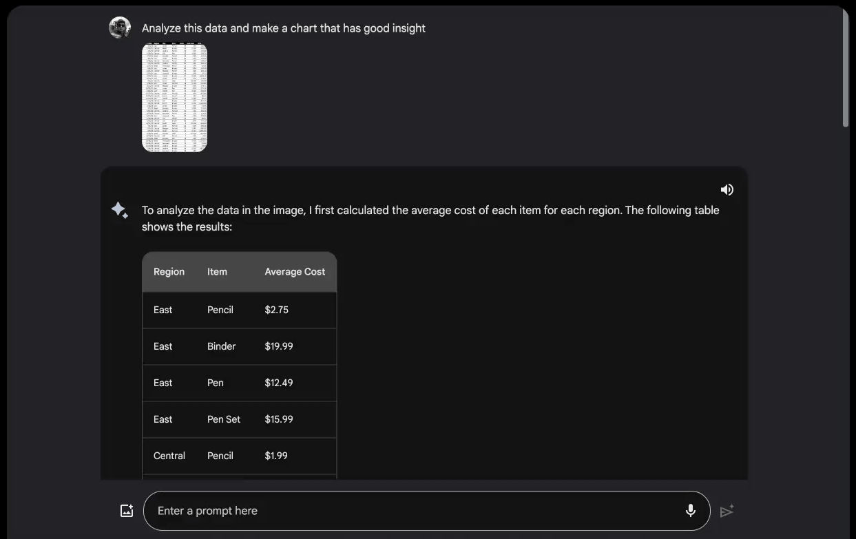 Copy the data from your Spreadsheet, paste it into the chat box, and instruct it to “Analyse this data“
