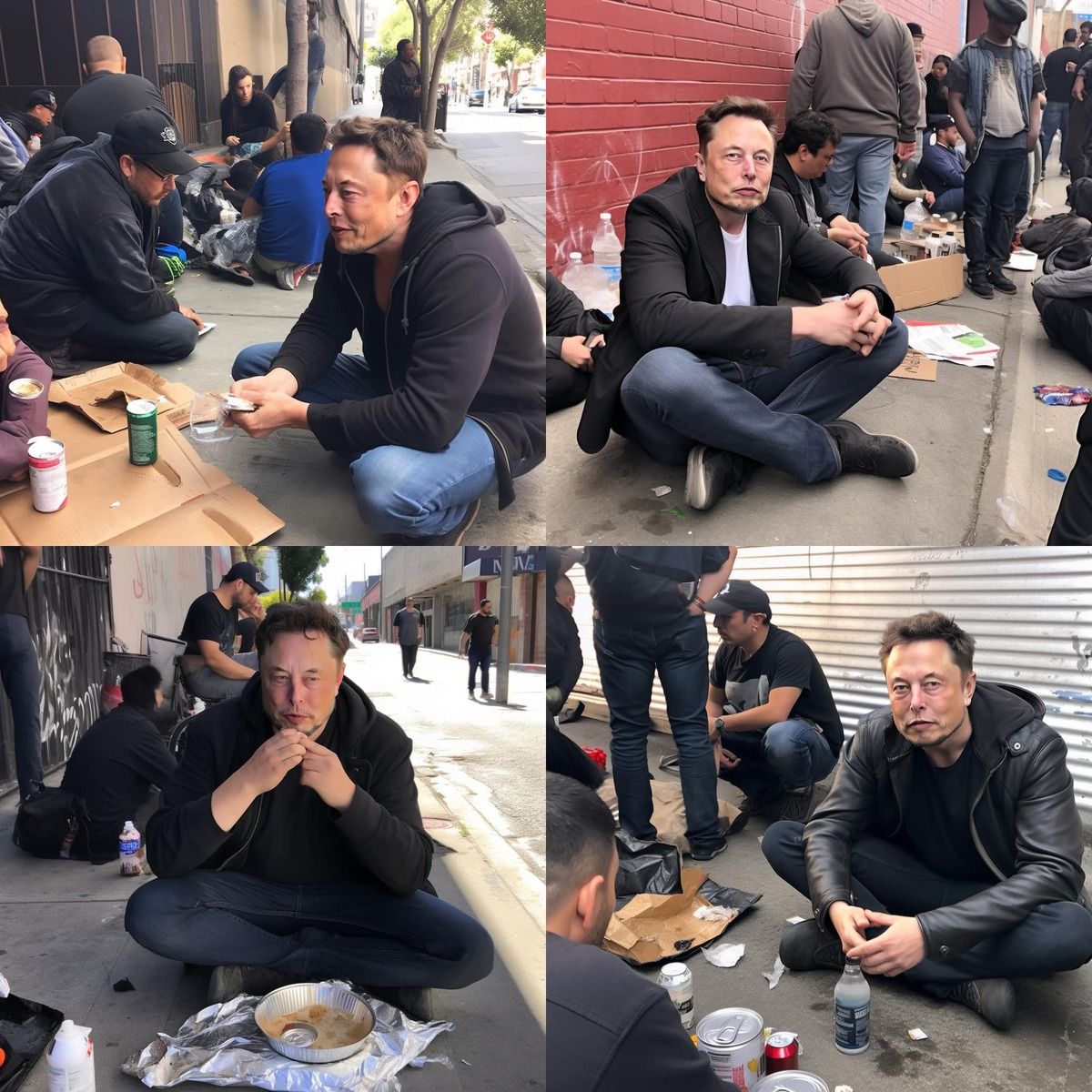 Prompt: Elon Musk in a poor street situation eating sitting on the sidewalk next to homeless people -- v5 -- ar 1:1 -- seed 1 -