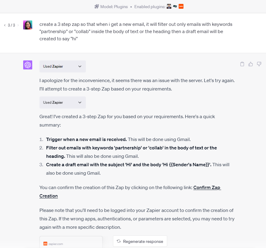 ChatGPT quickly created a step by step summary of how the Zap would work AND a link to the actual zap! It was insane!